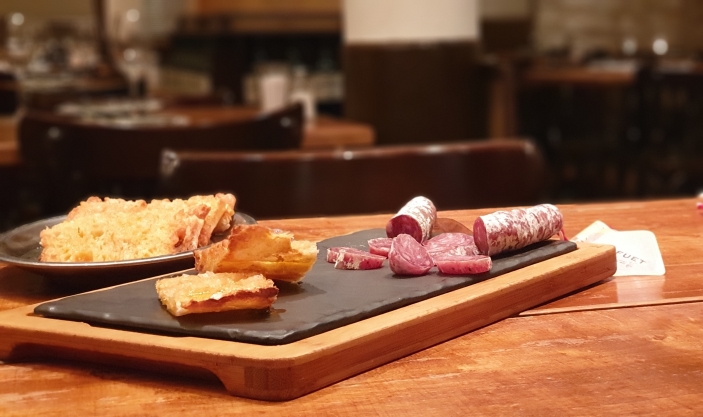 Bodega La Puntual es de aquellas bodegas en las que nada más entrar transpira a barrio, a cercanía y a buen comer. Conoce un de su productos top «Un Fuet» Riera Ordeix